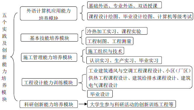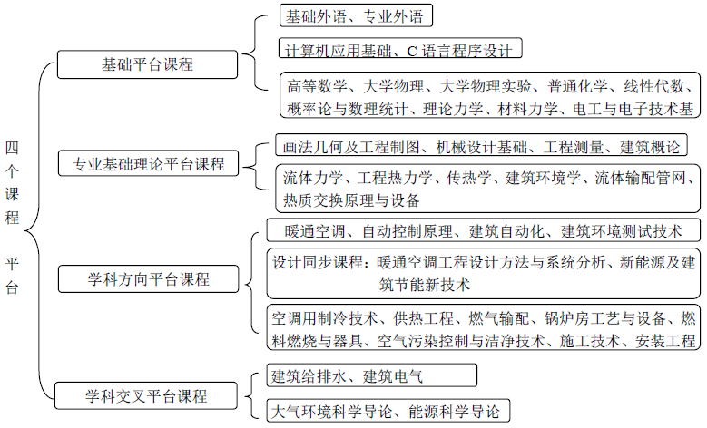 围绕专业核心课程,建设具有特色的课程体系,拓宽专业知识,加强实践教学环节,优化教学计划,按照三个教学阶段(公共基础课教育阶段、专业基础理论课教育阶段、专业课教育阶段)、四个课程平台体系(基础平台课程、专业基础理论平台课程、学科方向平台课程、学科交叉平台课程)和五个实践与创新能力培养模块(外语、计算机应用能力培养模块、基本技能培养模块、施工管理能力培养模块、工程设计能力训练模块、科研创新能力培养模块)的方式组织教学。通过教学计划优化,提高了知识的互联性、贯通性、整体性及对新领域和交叉学科的辐射性。坚持课程建设与教学改革相结合,课程建设与教材建设相结合,课程建设与提高教学质量相结合。已开设和建设多门双语教学课程,积极开展建筑环境与能源应用工程慕课和翻转课堂建设。