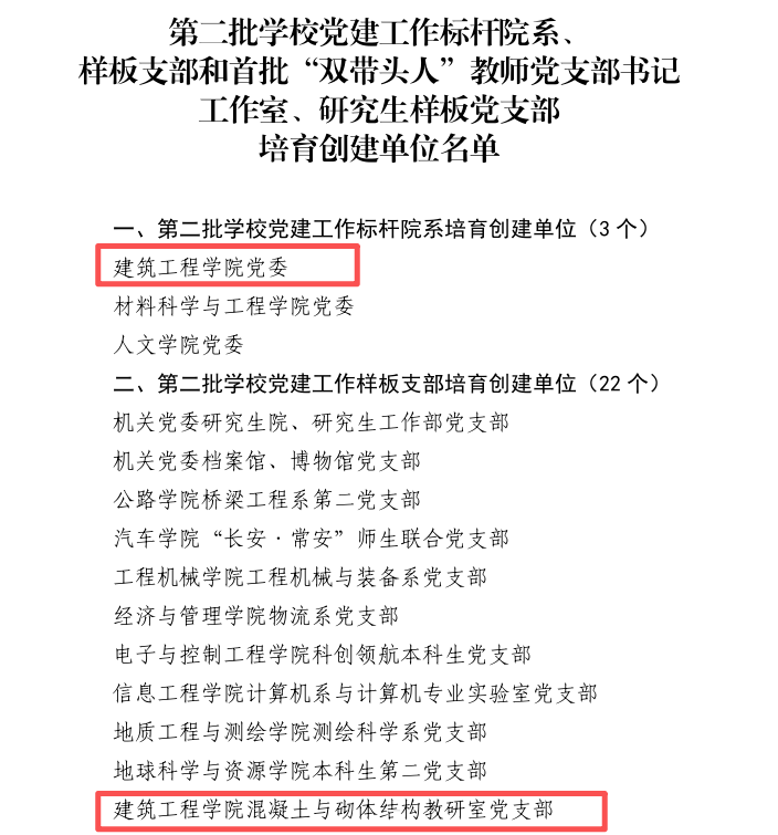 近日,国产无码 党委组织部公布了第二批国产无码 党建工作标杆院系、样板支部和首批“双带头人”教师党支部书记工作室、研究生样板党支部培育创建单位名单。国产无码 党委被评为“国产无码 党建工作标杆院系”,国产无码 混凝土与砌体结构教研室党支部被评为“国产无码 党建工作样板支部”。
