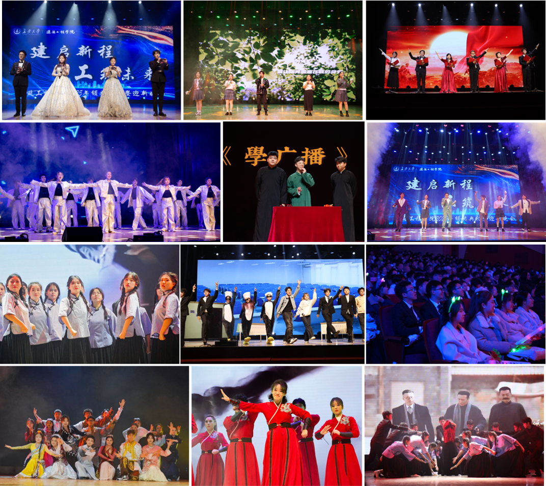 颁奖典礼结束后,迎新晚会在热烈的欢呼声中正式拉开帷幕。开场舞《梦想启航》以灵动舞姿点燃现场,展现新生蓬勃朝气;相声《学广播》巧妙融入校园生活,幽默诙谐,引发共鸣;歌曲串烧《在时间中回答》通过旋律演绎青春成长的心路历程;街舞《舞绘山河》以中国风编排展现传统与潮流的融合;小品《指尖上的诱惑》聚焦网络时代大学生的现实思考;民族舞《锦绣中华》以多元舞姿呈现民族团结之美;《青春之歌》《山河永念・吾辈当歌》通过朗诵与舞蹈,诠释建工青年筑梦山河的青春担当;尾声合唱《星火青春》以温暖歌声既表达不舍,更许下未来约定。